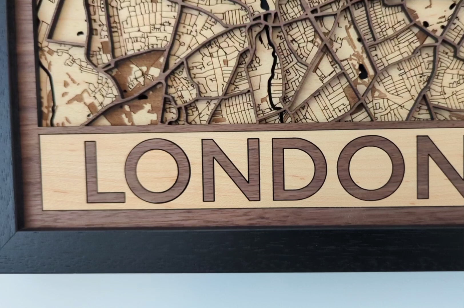 Laser cut from layers of maple, walnut and frosted blue acrylic, this beautiful wooden map is a great way to display central London (area shown extends from Westminster to Bermondsey) The top layer and frame surround is walnut.